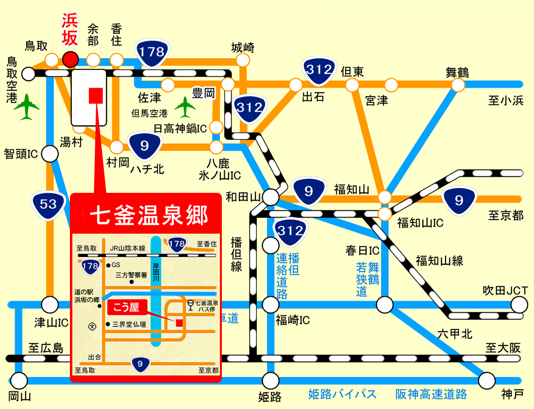 七釜温泉は、浜坂温泉郷と呼ばれる「七釜温泉」「二日市温泉」「浜坂温泉」の三つの温泉地の一つです。
