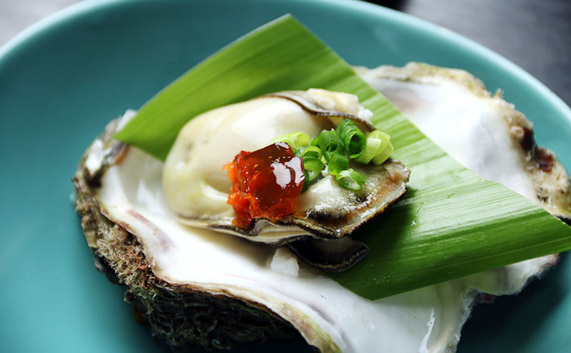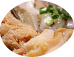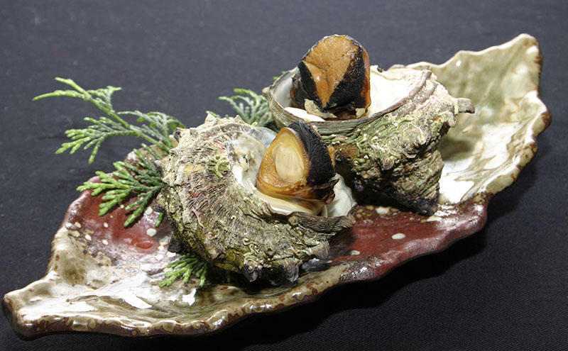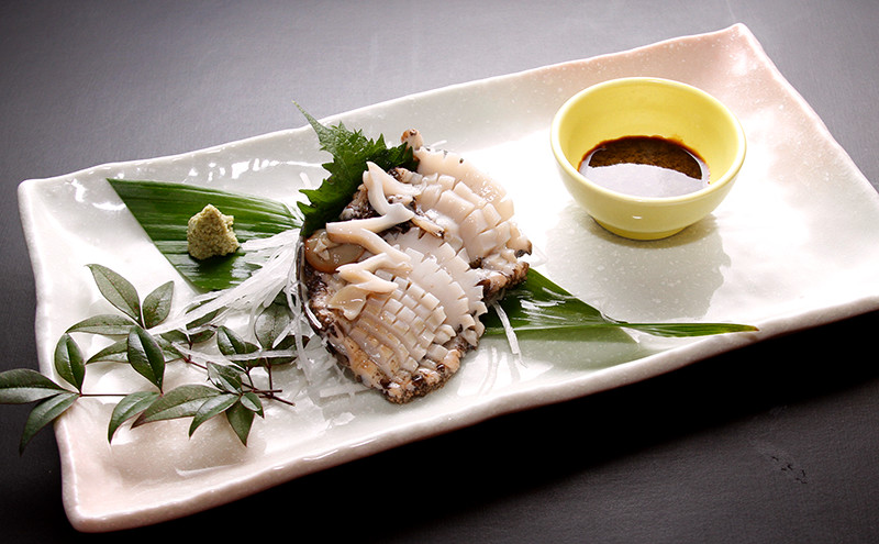 こう屋では、アワビの刺身を肝醤油でいただくことができる。